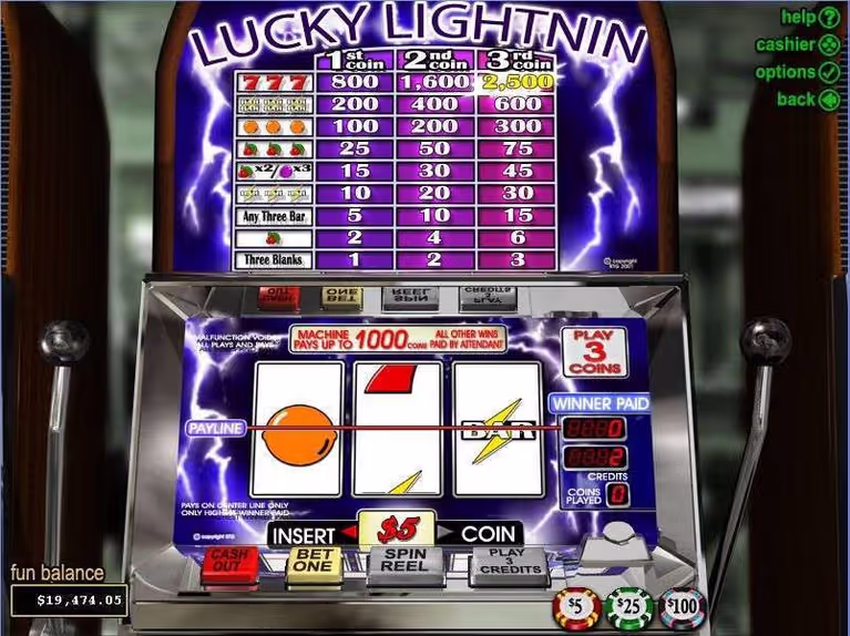 Lucky Lightning slots is a three-reel game with just one payline. Lining up two or three of the same symbols on the payline awards the player with a payout. The details of each symbol and what it pays are detailed on the screen next to the reels. Symbols in the game include bars, red sevens, cherries, plums and oranges. Players can place one, two or three coins per spin. There is a choice of coin sizes that ranges from $0.05 up to $5 with the maximum bet per spin being $15.